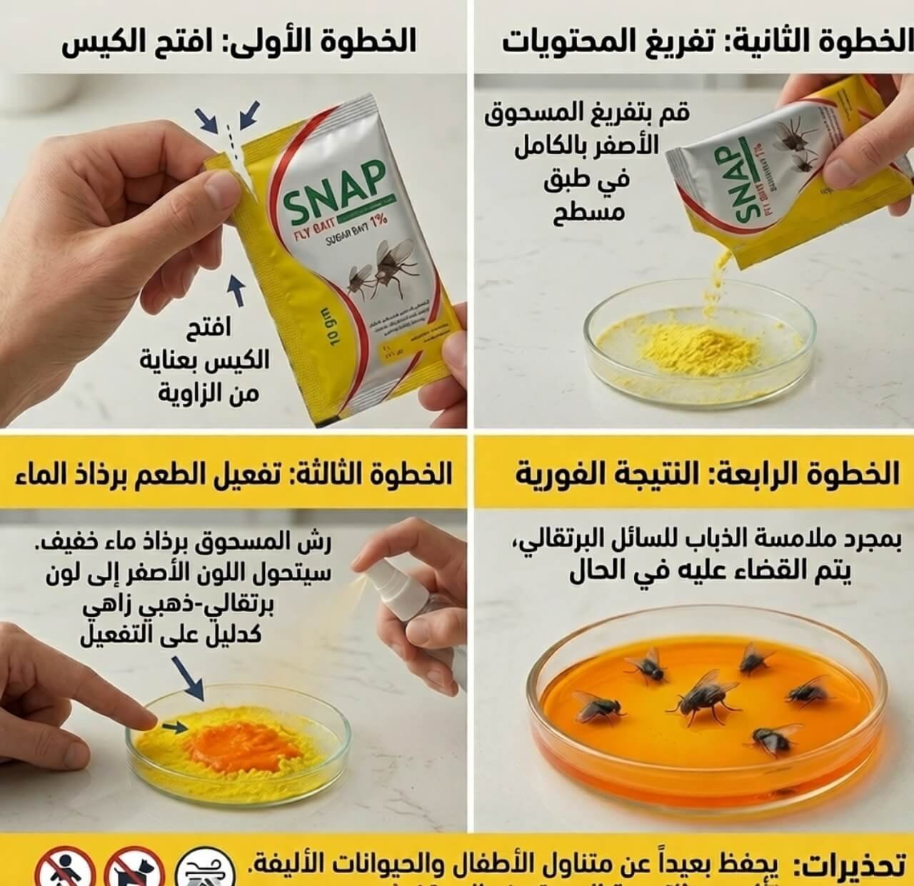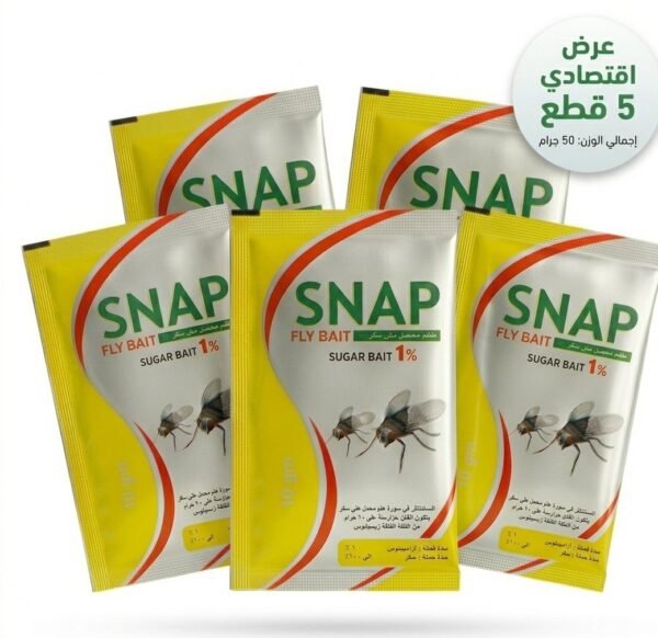يُعد سناب الحل الأمثل والأسرع لمكافحة الذباب؛ بتركيبته المتطورة التي تعتمد على طعم سكري جذاب بنسبة 1%، مما يضمن استجابة فورية وإبادة فعالة.